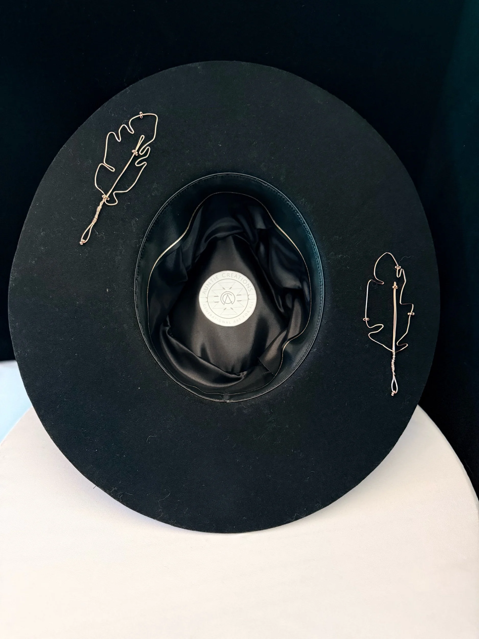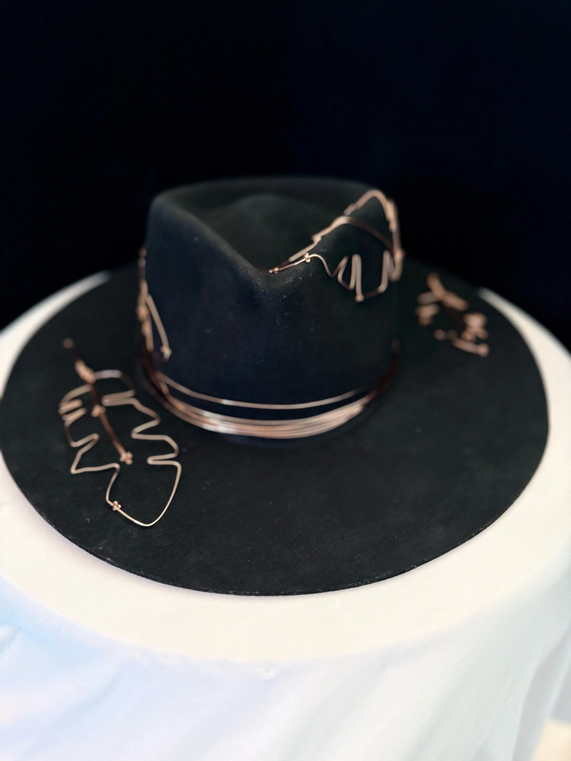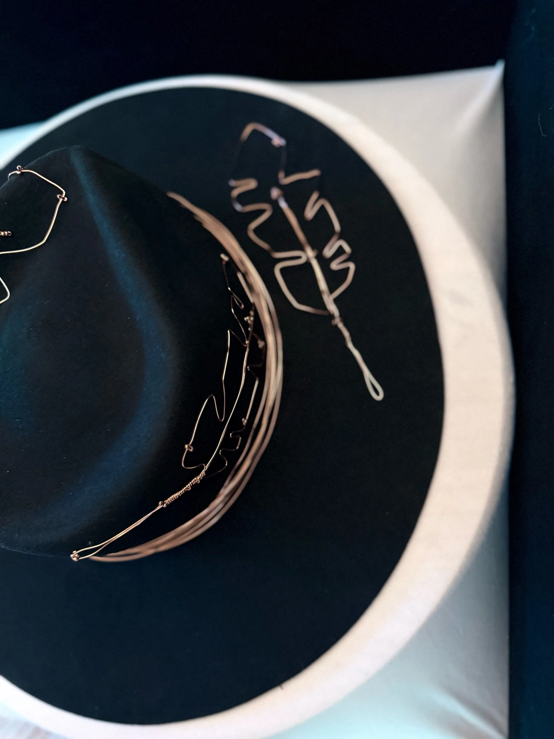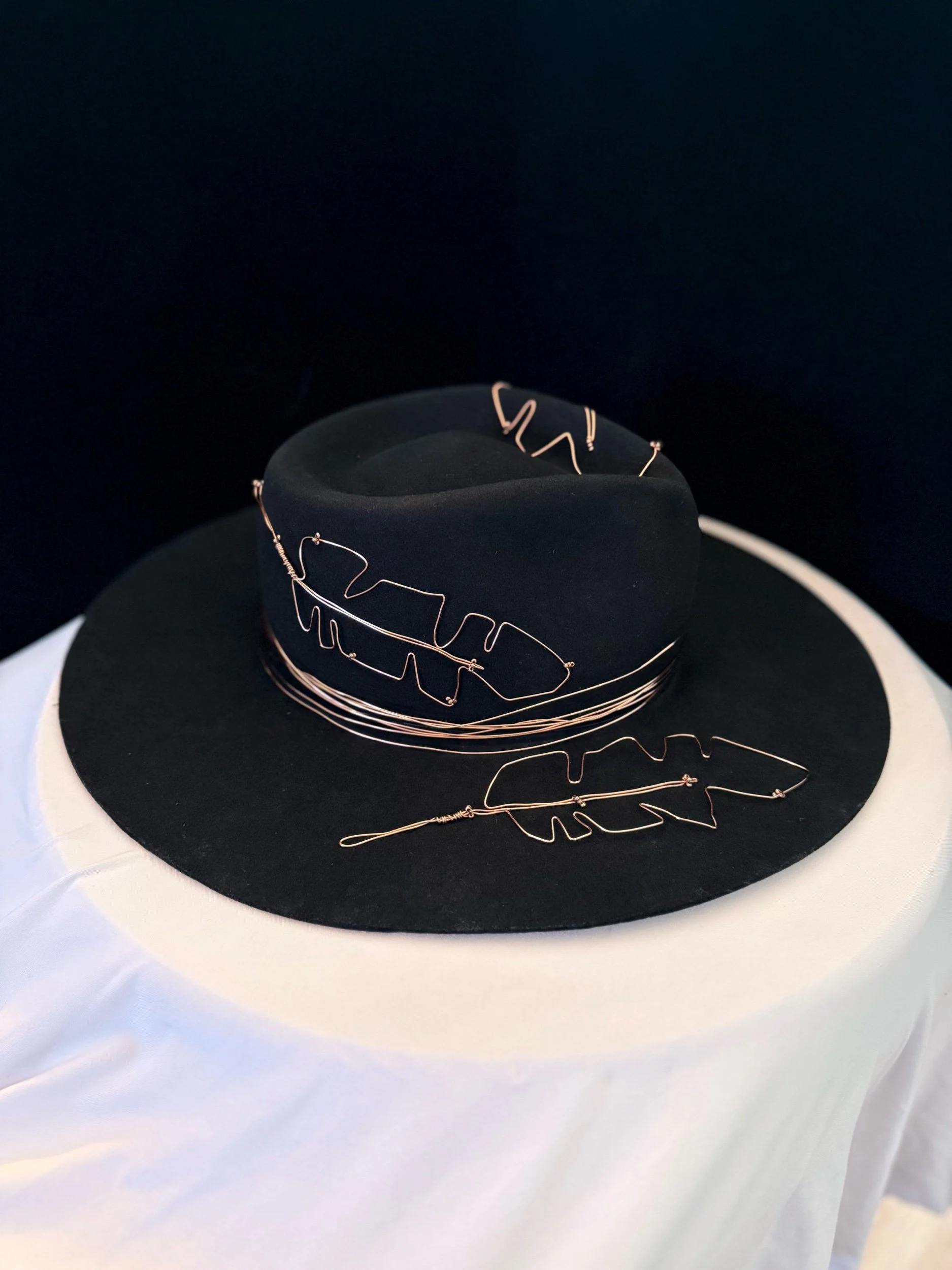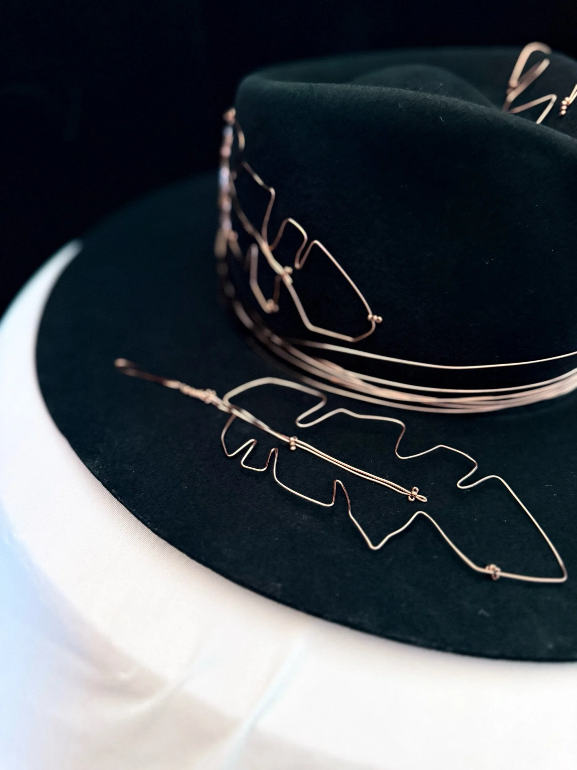 30 gauge copper wire feathers accent the brim, top and bottom